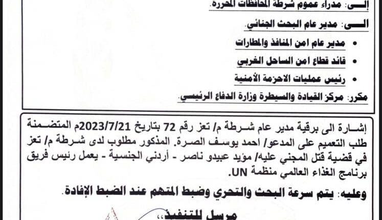 كشفت مصادر خاصة عن مكان تواجد قاتل مدير مكتب الغذاء العالمي في تعز، والذي يعد أحد أبرز العناصر الإرهابية المطلوبة في عدن والذي احتضنته السلطات في تعز بعد فراره من العاصمة عدن.