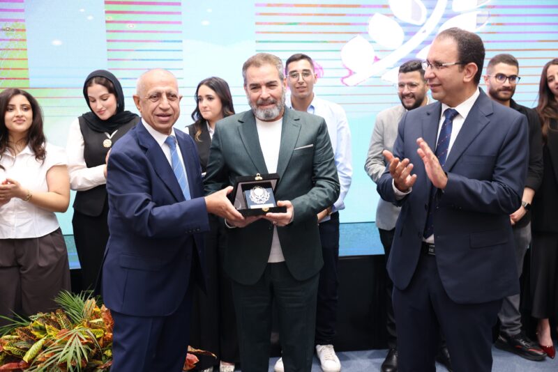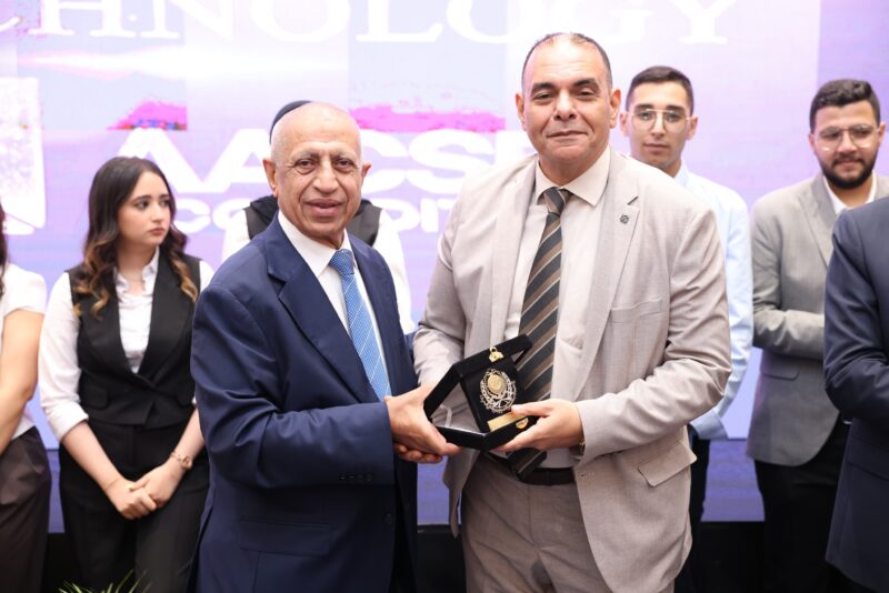 كما قام طلاب قسم الإعلام بكلية الإدارة والتكنولوجيا بالأكاديمية العربية بتقديم درع الكلية لسعادة الأستاذ الدكتور رئيس الأكاديمية.