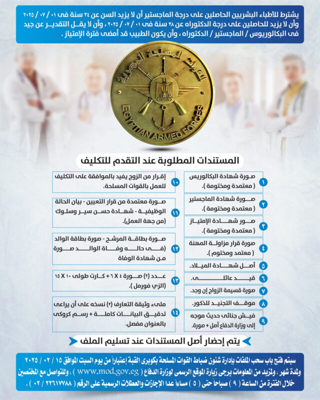 صدق الفريق أول عبد المجيد صقر القائد العام للقوات المسلحة وزير الدفاع والإنتاج الحربي على الإعلان عن قبول دفعة جديدة من الأطباء البشريين الحاصلين على درجة الماجستير والدكتوراه للعمل كضباط مكلفين بالقوات المسلحة بالصفة العسكرية دفعة يوليو 2025.