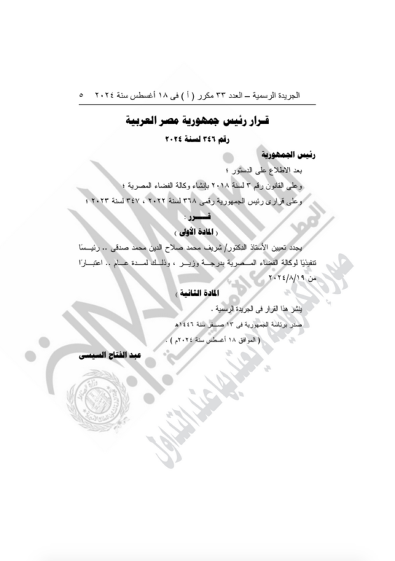 قرار جمهوري بتجديد تعيين شريف صدقي رئيسا تنفيذيا لوكالة الفضاء لمدة عام أخبار مصر في الثلاثاء, 20 أغسطس , 2024, الساعة 12:45 ت القاهرة شارك المقالة أصدر الرئيس عبدالفتاح السيسي قرارا برقم 346 لسنة 2024 بتجديد تعيين الأستاذ الدكتور شريف محمد صلاح الدين محمد صدقي رئيسا تنفيذيا لوكالة الفضاء المصرية بدرجة وزير، وذلك لمدة عام اعتبارا من أمس الاثنين. قد يهمك ايضاً: بدء بث ختمة المصحف المرتل لطلاب الأزهر الشريف بإذاعة القرآن… الخميس, 6 نوفمبر , 2025, الساعة 19:59 ت القاهرة لتلاعبهم في الأسمدة المدعمة .. وزير الزراعة يحيل مسؤولي 4… الخميس, 6 نوفمبر , 2025, الساعة 19:26 ت القاهرة نشر هذا القرار في الجريدة الرسمية . شارك المقالة FacebookTwitterPinterestFacebook MessengerTelegramWhatsAppالبريد الإلكترونيPrint