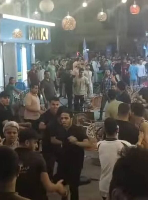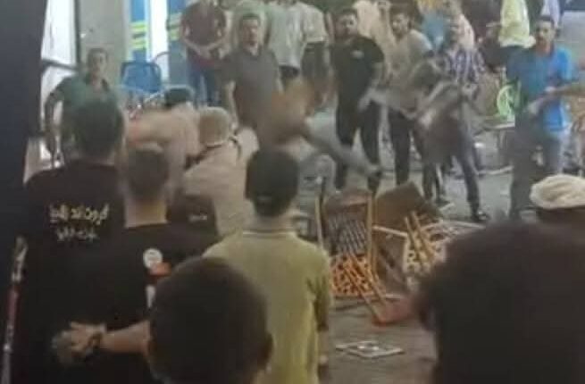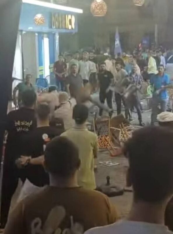 بدأت بمشادات كلامية ثم سرعان من تحولت إلى معركة ساخنة بين الطرفين استخدم فبها التشابك بالأيدي والمقاعد الخشبية مما أدى إلى تلف وتكسير بعض محتويات كلا المحالين ووقوع عدة إصابات بين الطرفين ، مما استدعى وصول قوات الأمن التى سيطرت على المعركة وضبط طرفى المعركة