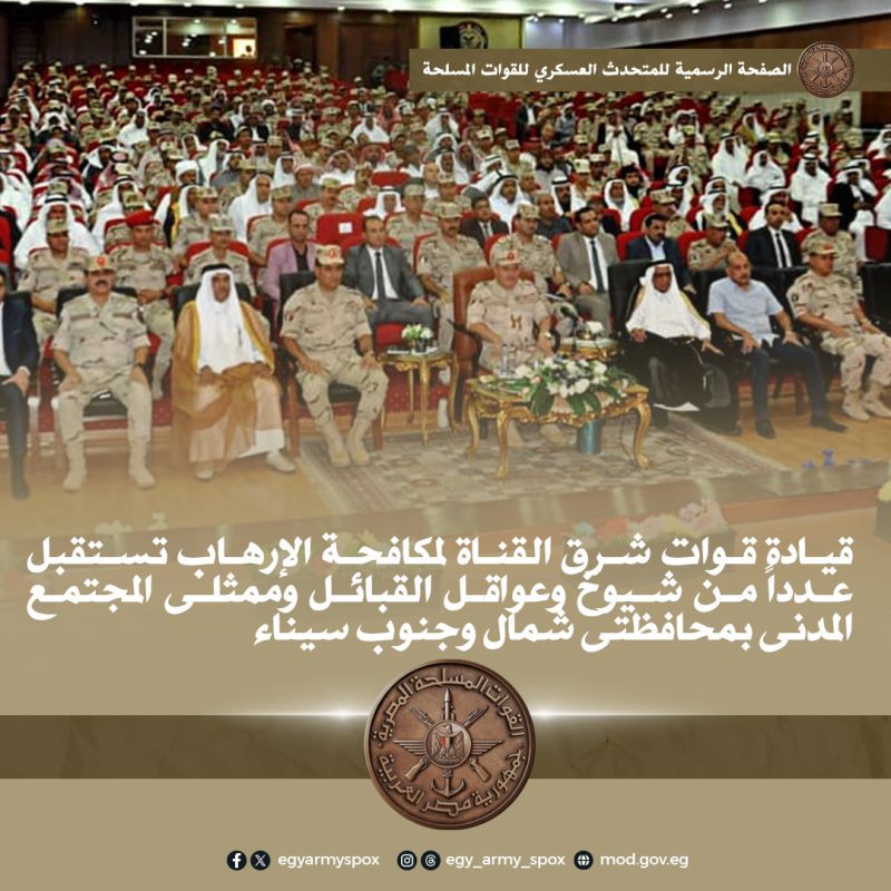 استقبلت قيادة قوات شرق القناة لمكافحة الإرهاب عددا من شيوخ وعواقل القبائل وقيادات الأجهزة الأمنية وممثلى المجتمع المدني بمحافظتي شمال وجنوب سيناء، وذلك في إطار حرص القوات المسلحة على التواصل المستمر مع أهالي سيناء وتبادل الرؤى في كافة الموضوعات والقضايا المرتبطة بالمواطن السيناوي.