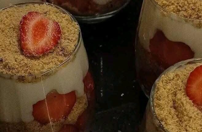 • نكرر الطبقات حسب الرغبة ونزين بشرائح الفراولة.