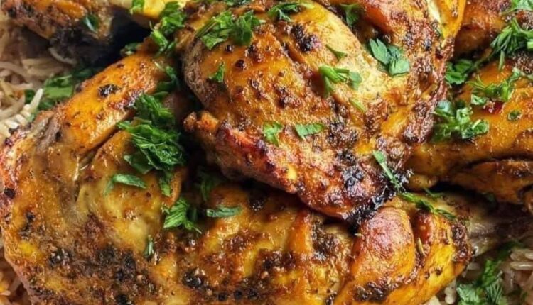 6- يقدم الارز في طبق التقديم ثم يوضع فوقه الدجاج و ممكن ان يزين بالمكسرات