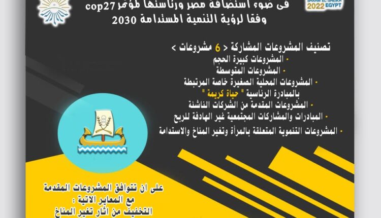 وأضاف بيان محافظة كفر الشيخ، أن تصنيف المشروعات المشاركة عبارة عن 6 فئات، مشروعات كبيرة الحجم، مشروعات متوسطة، مشروعات محلية صغيرة، ومشروعات خاصة ومرتبطة بالمبادرة الرئاسية “حياة كريمة”، والمشروعات المقدمة من الشركات الناشئة، والمبادرات والمشاركات المجتمعية غير الهادفة للربح، والمشروعات التنموية المتعلقة بالمرأة، وتغيير المناخ والاستدامة.