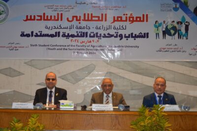تحت رعاية الدكتور عبد العزيز قنصوه رئيس جامعة الإسكندرية افتتح الدكتور علــى عبد المحسن عميد كلية الطب والقائم بتسيير أعمال نائب رئيس الجامعة لشئون التعليم والطلاب المؤتمر الطلابى السادس لكلية الزراعة الذى عقد تحت عنوان ” الشباب وتحديات التنمية المستدامة ” واستمرت أعماله لمدة يومين بمقر الكلية.