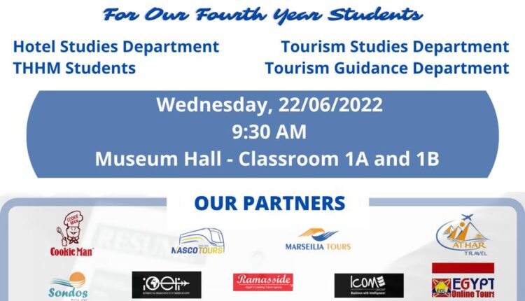 تنظم كلية السياحة والفنادق جامعة الإسكندرية صباح غدا الأربعاء ٢٢ /٦/ ٢٠٢٢، تحت رعاية الدكتور عبدالعزيز قنصوه رئيس جامعة الإسكندرية، ملتقى التوظيف لطلاب الفرقة الرابعة بالكلية، بمشاركة ٢٣ شركة ومؤسسة تعمل فى مجال السياحة والفنادق والمطاعم، وذلك بقاعه المتحف بمقر الكلية في تمام الساعه ٩.٣٠ صباحاً.