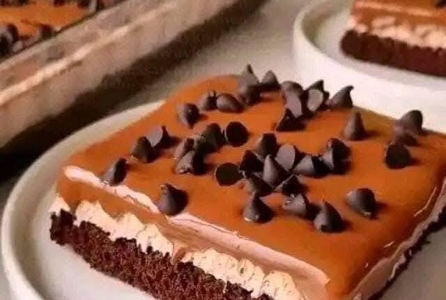 ثم صوص الشيكولاتة وحبيبات الشيكولاتة وادخلها الثلاجة وتقطيعها حسب الرغبة