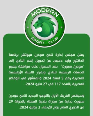 أعلن مجلس إدارة مودرن فيوتشر برئاسة الدكتور وليد دعبس، عن تحويل أسم النادي إلى “مودرن سبورت” بعد الحصول على موافقة جميع الجهات الرسمية وبقرار اللجنة الأوليمبية المصرية رقم 5 لسنة 2024 والمنشور في الوقائع المصرية بالعدد 117 في 27 مايو/أيار 2024.