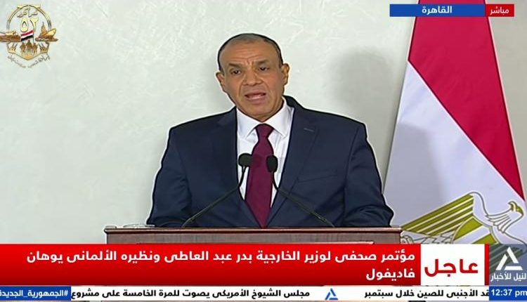 عقد الدكتور بدر عبد العاطي وزير الخارجية والهجرة وشئون المصريين بالخارج ، مؤتمرا صحفيا، اليوم الثلاثاء، مع نظيره الألماني يوهان ديفول.
