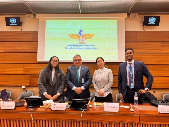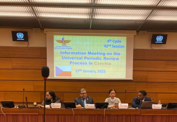 عقدت مؤسسة ماعت للسلام والتنمية وحقوق الإنسان من داخل قصر الأمم بجنيف، فعالية جانبية على هامش الاستعراض الدوري الشامل لدولة التشيك، ناقشت ماعت خلالها مدى تعاون التشيك مع الآليات الدولية لحماية حقوق الانسان، والتحديات التي تعوق إنشاء مؤسسة وطنية تمتثل لمبادئ باريس، بالإضافة إلي ملف أقلية الروما، وحقوق اللاجئين، وإيواء الدولة لعناصر إرهابية، وذلك بهدف توجيه توصيات إلى حكومة التشيك لتحسين أوضاع حقوق الإنسان داخلها.