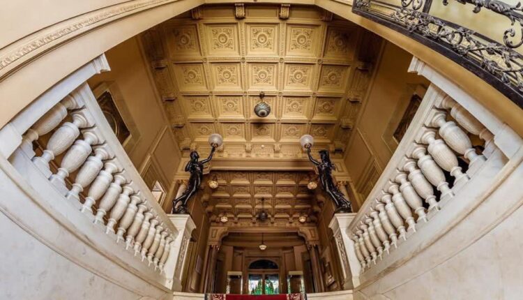 وعند مدخل القاعة، يستقبل الزائرين تمثالان لفتاتين ترمزان إلى ربات الشمس والقمر، بينما تطل من أعلى القاعة شرفة من الزجاج المعشق الملون تعكس مشاهد من الحياة اليومية الأوروبية، ويزين سقف القاعة بزخارف غنية من طراز الروكوكو تتدلى منها وحدات إضاءة نحاسية فاخرة مزينة بالزجاج المعشق، صُنعت خصيصًا للقصر.