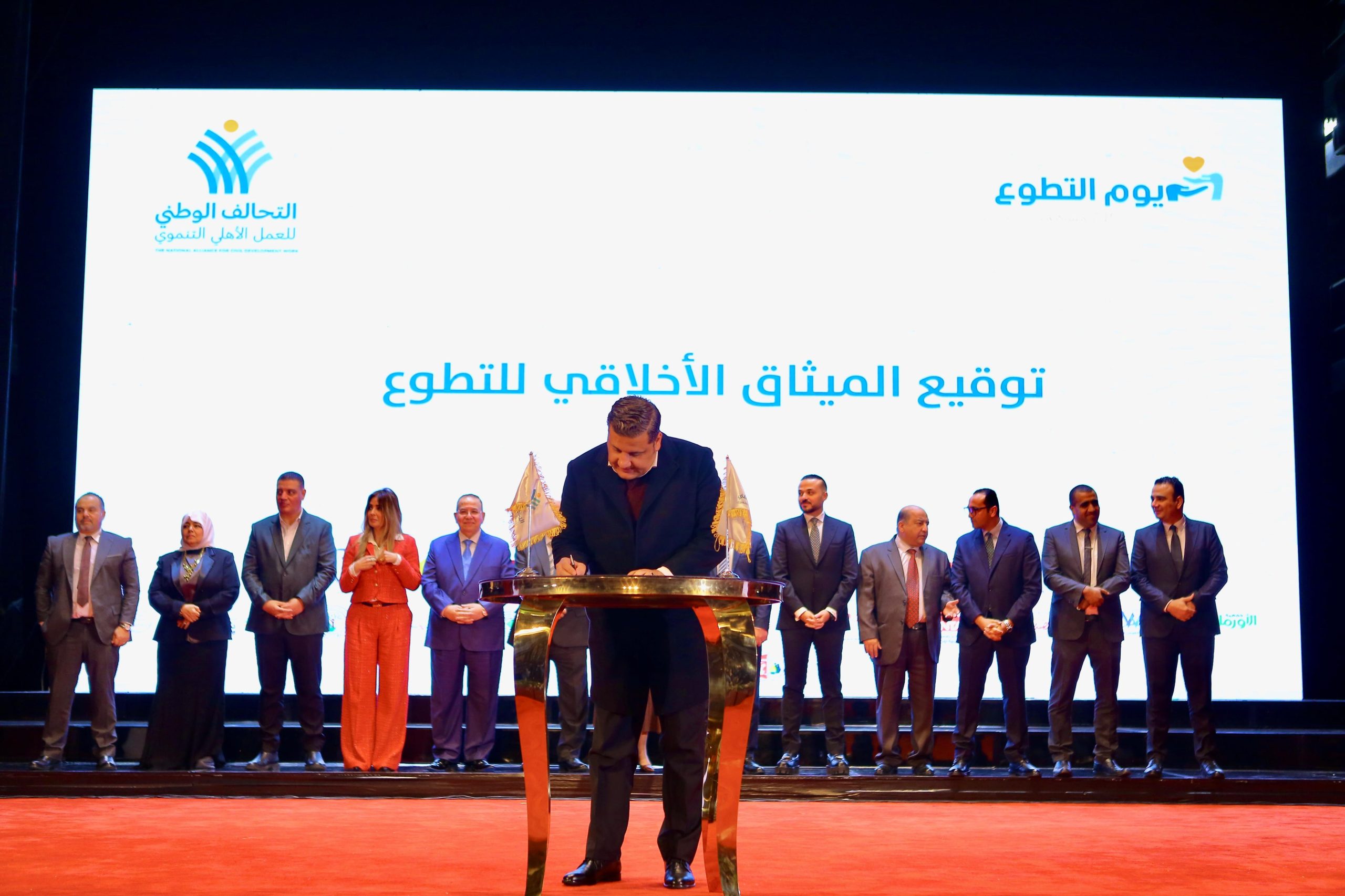 خلال الاحتفالية، وقع الدكتور مصطفى زمزم، على الميثاق الأخلاقي للعمل التطوعي، بعد أن شارك في إعداد بنوده مع مؤسسات المجتمع المدني