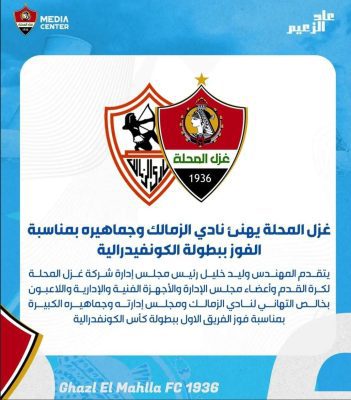 تقدم مجلس إدارة نادي غزل المحلة بالتهنئة لنادي الزمالك بمناسبه فوزه ببطوله الكونفدرالية الإفريقية