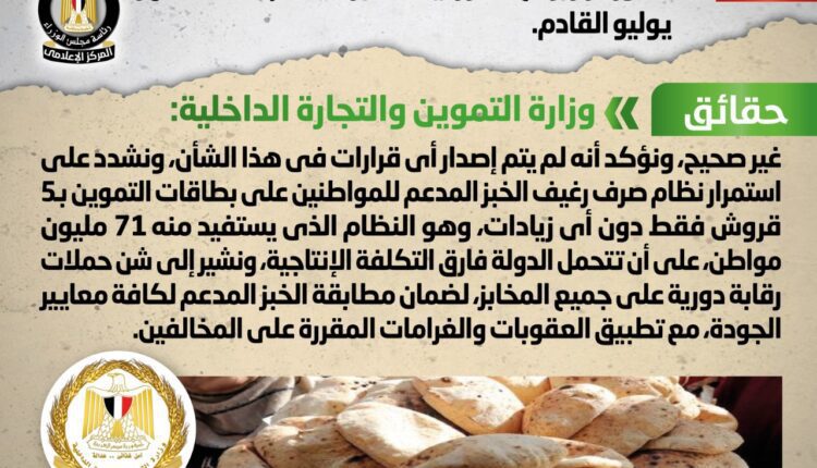 كشف المركز الإعلامي لمجلس الوزراء إنه فى ضوء ما تردد من أنباء بشأن صدور قرار برفع سعر رغيف الخبز المدعم بدءاً من شهر يوليو القادم، تواصل المركز مع وزارة التموين والتجارة الداخلية، والتي نفت تلك الأنباء، مُؤكدةً أنه لا صحة لرفع سعر رغيف الخبز المدعم بدءاً من شهر يوليو القادم، وأنه لم يتم إصدار أي قرارات في هذا الشأن، مُشددةً على استمرار نظام صرف رغيف الخبز المدعم للمواطنين على بطاقات التموين بـ5 قروش فقط دون أي زيادات، وهو النظام الذي يستفيد منه 71 مليون مواطن، على أن تتحمل الدولة فارق التكلفة الإنتاجية، مُشيرةً إلى شن حملات رقابة دورية على جميع المخابز، لضمان مطابقة الخبز المدعم لكافة معايير الجودة، مع تطبيق العقوبات والغرامات المقررة على المخالفين.