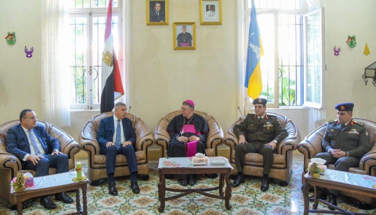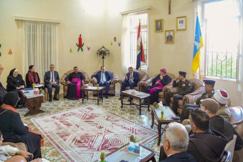 وتوجه المحافظ لتهنئة طائفة الروم الكاثوليك خلال احتفالاتهم بكاتدرائية سيدة النياح، حيث كان في استقباله المطران جان ماري شامي نائب إيبارشية مصر والسودان وجنوب السودان.
