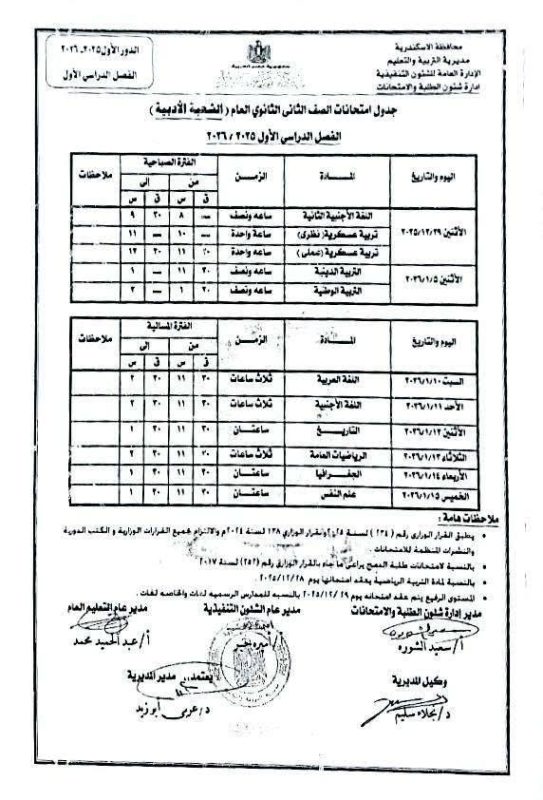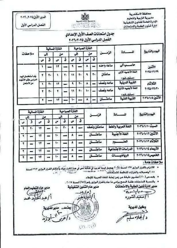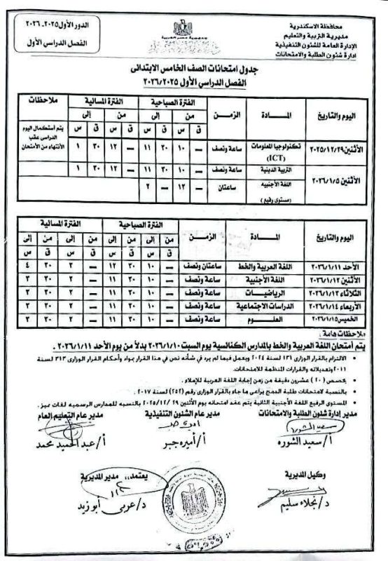 ووفقًا للجدول المعتمد، تبدأ الامتحانات في 29 ديسمبر 2025 وتنتهي في 22 يناير 2026، على أن تُجرى امتحانات المواد غير المضافة للمجموع خلال الفترة من 29 ديسمبر 2025 حتى 5 يناير 2026.