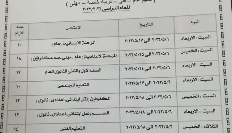 محافظ الاسكندرية بدء الامتحانات في 6 مايو وتنتهي في 25 مايو 2023 وفق الخريطة الزمنية التي وافق عليها المجلس الأعلى للتعليم قبل الجامعي لهذا العام الدراسي