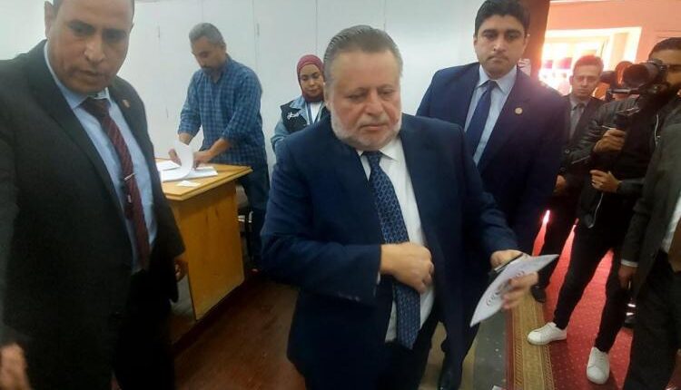 ادلي حسن عبدالله محافظ البنك المركزي والمستشار مسعد الفخراني رئيس هيئة قضايا الدولة والدكتور بهاء أبو بوشقة وكيل مجلس الشيوخ والفنانة لبلبة يدلون باصواتهم في الانتخابات الرئاسية امام لجنة هيئة التعمير والتنمية الزراعية بالدقي .