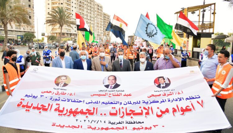 شهد الدكتور طارق رحمي محافظ الغربية ، مساء اليوم ، انطلاق مسيرة شبابية من تنظيم الإدارة المركزية للبرلمان والتعليم المدني بمديرية الشباب والرياضة للاحتفال بمرور سبع أعوام من الإنجازات وانطلاق الجمهورية الجديدة في عهد الرئيس عبد الفتاح السيسي رئيس الجمهورية، وذلك بحضور السادة النواب (عبد المنعم شهاب، اللواء غباشي بدير، سامح حبيب) والأستاذ أحمد الوكيل وكيل وزارة الشباب والرياضة بالغربية.
