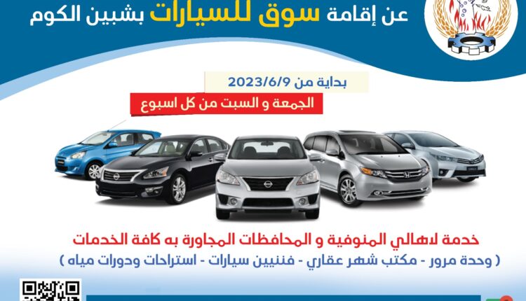 قرر اللواء إبراهيم أبو ليمون محافظ المنوفية عن دخول السيارات مجانا أول أسبوعين من إفتتاح سوق السيارات الجديد واعفاؤها من كافة الرسوم ، والمقرر افتتاحه الجمعة القادمة علي طريق شبين الكوم قويسنا مدخل قرية ميت خلف أمام مدرسة الألسن ، مشيرا الي انه سيتم تنظيمه يومى الجمعة والسبت من كل أسبوع بصفة دورية.