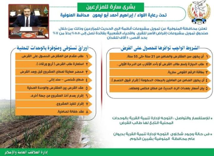 وأشار محافظ المنوفية، إلى أنه قام بإتخاذ عدة قرارات لإنجاح التجربة ، حيث تم تخفيض سعر الفائدة من 7 % الى 5,5 % ، ورفع الحد الأقصى للإقراض لتصل إلى 20 ألف جنية ، كما تم تخصيص 10 ألاف جنية لكل فدان زراعي ، ومد فترة السداد إلى سنتين ونصف ، بالإضافة إلى توفير كافة الأوراق الخاصة بالإقراض في كل وحدة محلية وذلك لتشجيع المزارعين للإقبال على استخدام النظم الحديثة والمطورة للري.