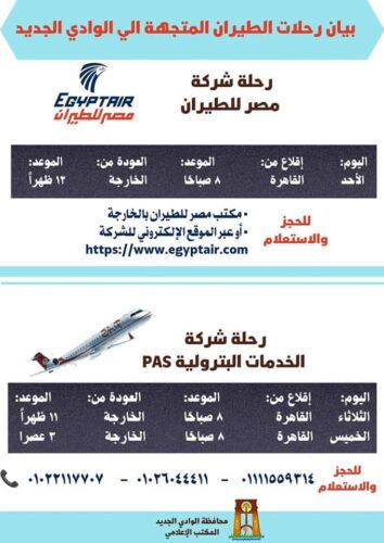 ويُذكر أنه بإضافة رحلة مصر للطيران إلى رحلتي شركة الخدمات البترولية تنتظم لدى المحافظة ثلاث رحلات جوية أسبوعية (القاهرة _ الخارجة).
