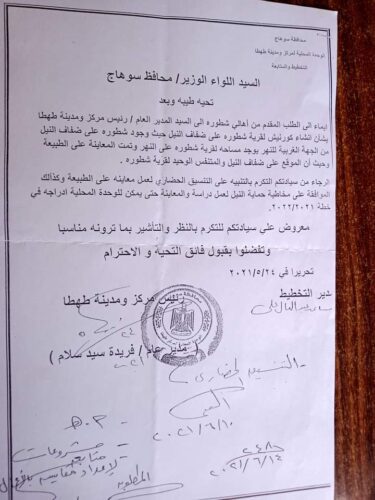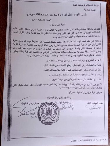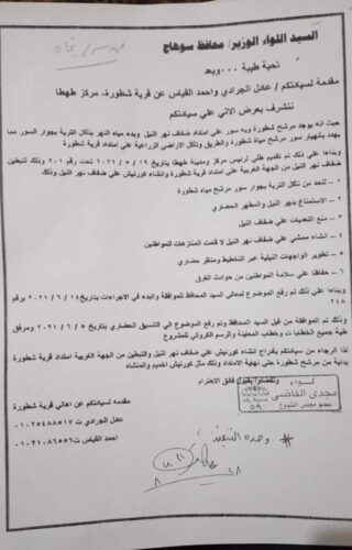 وكان كلا من عادل الجرادى وأحمد القياس، من أهالى قرية شطورة ، قد تقدما بعدة طلبات فى وقت سابق للدكتورة فريدة سلام ، رئيسة مركز ومدينة طهطا السابقة وإلى،محافظ سوهاج بهذا الشأن والتى قامت بدورها بعرض مذكرة على اللواء طارق الفقى محافظ سوهاج وبعد استيفاء المطلوب من أوراق وخرائط ومعاينات على الطبيعة ، قرر محافظ سوهاج الموافقة وتحويل الأمر إلى إدارة التنفيذ وإنشاء الكورنيش من منحة البنك الدولى لتطوير الريف المصرى.