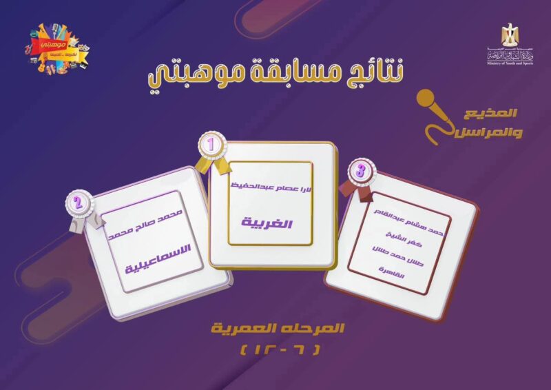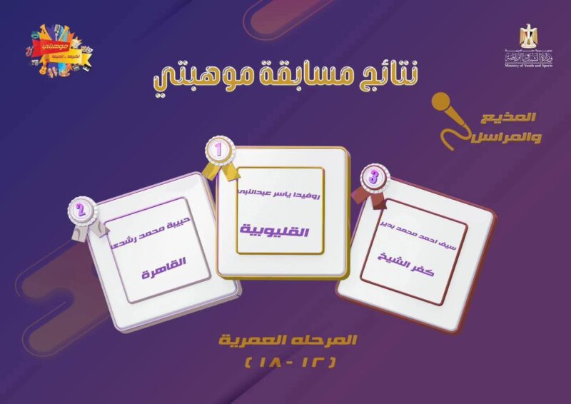 من جانبه، أوضح الدكتور عزت محروس، وكيل وزارة الشباب والرياضة، أن المسابقة تستهدف الفئات العمرية من 8 إلى 12 عامًا، ومن 12 إلى 18 عامًا، وتشمل مجالات متعددة منها الاستعراضات، الغناء، العزف، التمثيل، المسرح، الإنشاد، الشعر، القصة، الحكي، الدوبلاچ، الابتكارات العلمية، المبادرات المجتمعية، الدوري الثقافي، الإعلام، وغيرها من الفنون التي تسهم في تنمية مهارات النشء.