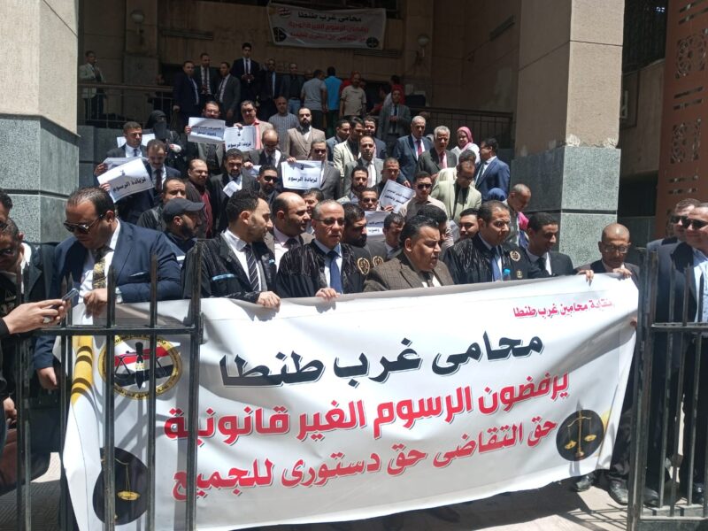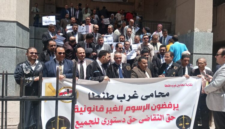 نظمت نقابة محامين الغربيه اليوم وبالتنسيق مع نقابة المحامين بالقاهره وقفه ظهر اليوم الاثنين علي السلم الرئيسي لمحكمة طنطا الابتدائيه مطالبين بإلغاء الرسوم الغير دستوريه والتي صدرت بدون قانون و مخالفه للدستور والقانون