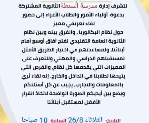 وجهت مدرسة السنطه الثانوية بقيادة مدير المدرسه أنور شهود ومجلس أمناء المدرسه الدعوه لأولياء أمور وطلبة الصف الثالث الثانوي للحضور الي المدرسه الساعه العاشره صباحا يوم الثلاثاء الموافق 2025/8/26 وذلك ليقوم مدير المدرسه بعرض الفرق بين الثانويه العامه وشهادة البكالوريا التي أعلنت عن تطبيقها وزارة التعليم في العام الدراسي 2026/2025