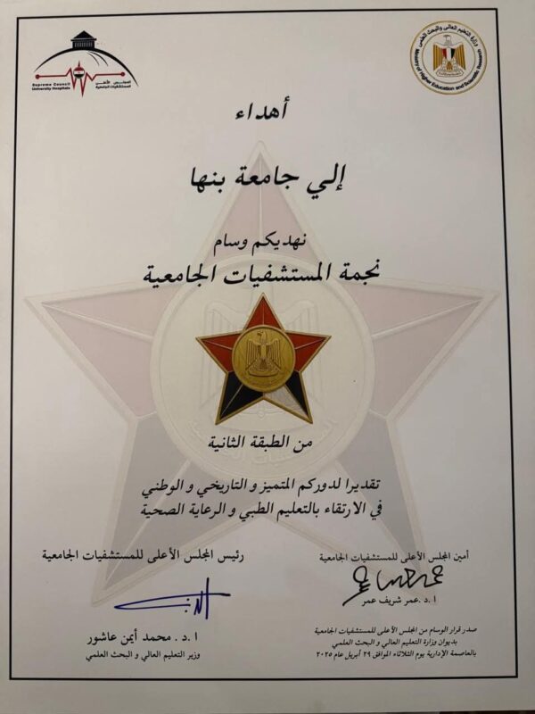 يأتي هذا الوسام ليعكس مكانة مستشفيات جامعة بنها كمؤسسة رائدة في تقديم الخدمات العلاجية والتعليمية، ولتؤكد أن التميز في القطاع الطبي الجامعي ليس خيارًا، بل واجب وطني ومسؤولية أخلاقية تجاه المواطن.