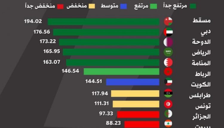 ومؤشر جودة الحياة يقيّس معايير مثل الأمان، الرعاية الصحية، وتكلفة المعيشة.