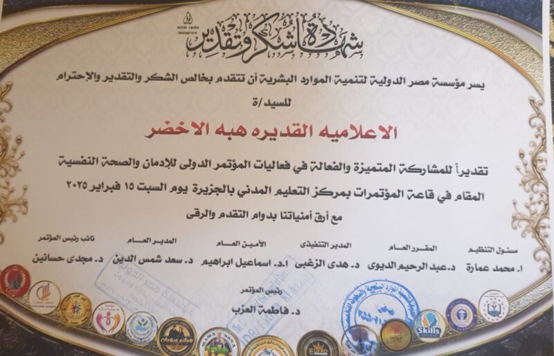 في إطار مشاركاتها الفعاله في مجال العمل العام وخدمه الوطن شاركت الاعلامية البارزه هبه الأخضر كبير المذيعات بالتليفزيون المصري في مؤتمر عام عن الإدمان والصحه النفسيه وحمايه الشباب من الأجيال القادمه من هذا الخطر ، كلن ذلك في المؤتمر الكبير الذي تم بقاعه المؤتمرات بمركز التعليم المدني بالجزيرة والذي شارك فيه نخبه من المثقفين وقاده الرأي والفكر في مصر ، وتميزت الاعلامية الكبيره بكلمه هادفه واعيه لاقت إستحسان الحضور وتم منحها شهاده تكريم تقديرا لجهودها في الخدمه العامه خاصه ما يتعلق بحروب الجيل الرابع وقضايا الوعي وحمايه الشباب.