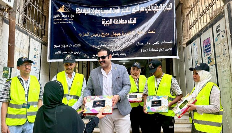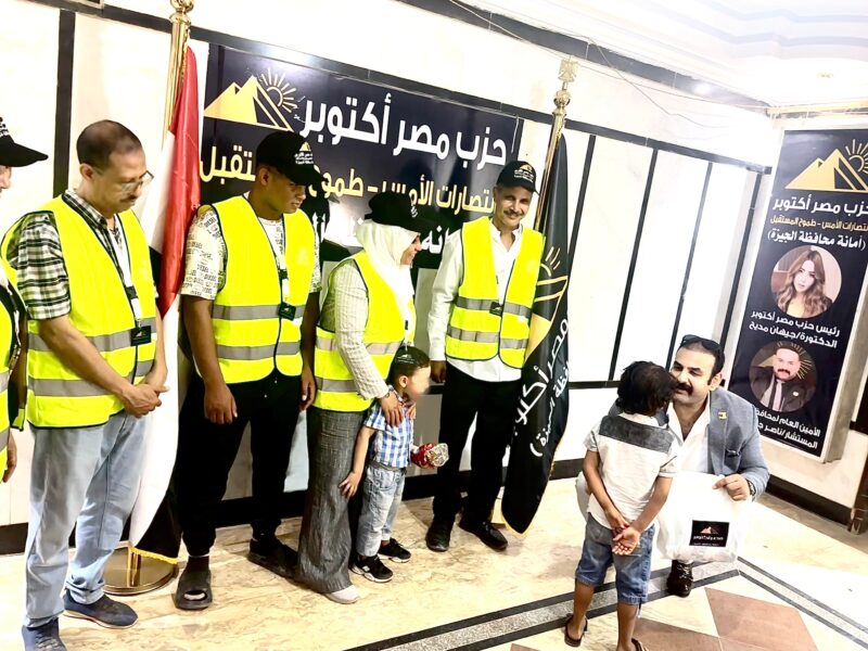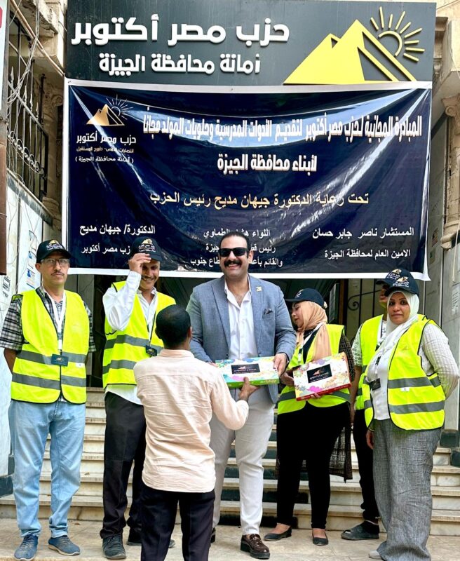 تحت رعاية رئيس حزب مصر أكتوبر الدكتورة جيهان مديح، نظمت أمانة الحزب بالجيزة برئاسة المستشار ناصر جابر حسان الأمين العام للمحافظة المبادرة المجانية لتقديم حلوى المولد النبوي الشريف ومستلزمات المدارس للأطفال الأيتام وللأسر الأكثر احتياجا.