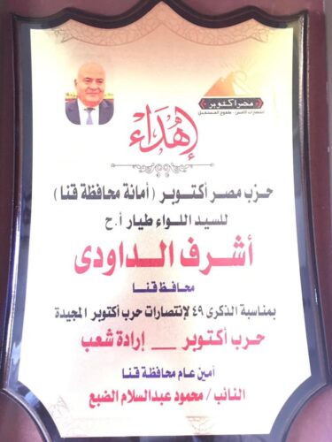 تقدم النائب السابق محمود الضبع أمين محافظة قنا بحزب مصر اكتوبر بتقديم التهنئة ودرعًا بأسم الحزب إلى اللواء طيار أ. ح أشرف الداودي، محافظ قنا في إطار احتفال الحزب بالذكرى الـ49 لنصر أكتوبر بناءً على توجيهات الدكتورة جيهان مديح رئيس الحزب، والدكتور محمد بدران النائب الأول والأمين العام للحزب.