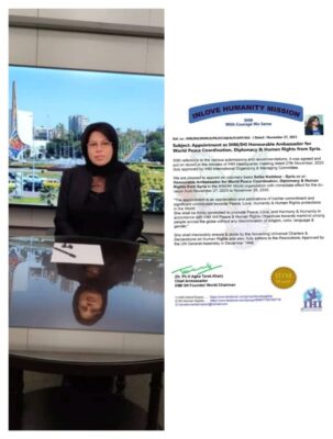 تتقدم صحيفة مصر البلد الإخبارية والدكتورة هدير عبدالعظيم رئيس القسم السياسي بالتهنئة للدكتورة صفاء قدور لتعيينها سفيرة فخرية لتنسيق السلام العالمي والدبلوماسية وحقوق الإنسان من سوريا في منظمة IHM/IHI العالمية بأثر فوري للفترة من 27 نوفمبر 2023 إلى 26 نوفمبر ، 2030″وذلك تقديرأ وإعجاباً لالتزامها ومساهمتها الكبيرة في تحقيق السلام والمحبة والإنسانية وحماية حقوق الإنسان في العالم.