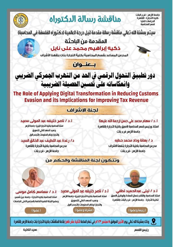 تتقدم جريدة مصر البلد الإخبارية بخالص التهاني والتبريكات للدكتورة زكية إبراهيم محمد نايل المدرس المساعد بكلية التجارة جامعة الأزهر، لحصولها علي الدكتوراة بدرجة امتياز لحصولها على درجة الدكتوراة فى فلسفة المحاسبة،بتقدير إمتياز