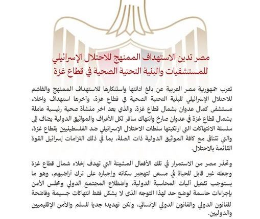أعربت مصر عن بالغ إدانتها واستنكارها للاستهداف الممنهج والغاشم للاحتلال الإسرائيلي للبنية التحتية الصحية في قطاع غزة، وآخرها استهداف وإخلاء مستشفى كمال عدوان بشمال قطاع غزة، والذي يعد آخر منشأة صحية رئيسية عاملة بشمال قطاع غزة في عدوان صارخ وانتهاك سافر لكل الأعراف والمواثيق الدولية يضاف إلى سلسلة الانتهاكات التي ارتكبتها سلطات الاحتلال الإسرائيلي ضد الفلسطينيين بقطاع غزة والتي تتنافى مع كافة المواثيق الدولية ذات الصلة، بما في ذلك التزامات إسرائيل القوة القائمة بالاحتلال.