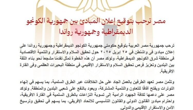 رحبت جمهورية مصر العربية بتوقيع حكومتي جمهورية الكونغو الديمقراطية وجمهورية رواندا على إعلان مبادئ فى واشنطن أمس (الجمعة) حول تحقيق السلام والاستقرار والتنمية الاقتصادية في منطقة شرق الكونغو الديمقراطية.