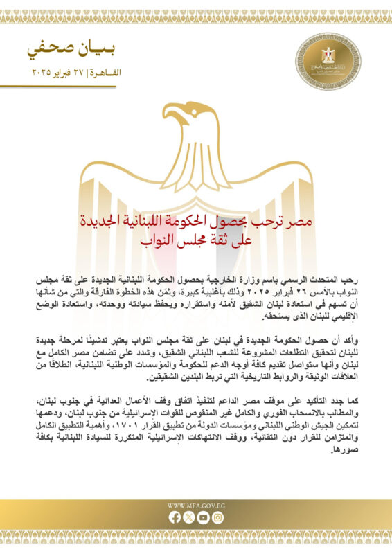 وأكد أن حصول الحكومة الجديدة في لبنان على ثقة مجلس النواب يعتبر تدشينا لمرحلة جديدة للبنان لتحقيق التطلعات المشروعة للشعب اللبناني الشقيق، مشددا على تضامن مصر الكامل مع لبنان وأنها ستواصل تقديم كافة أوجه الدعم للحكومة والمؤسسات الوطنية اللبنانية; انطلاقا من العلاقات الوثيقة والروابط التاريخية التي تربط البلدين الشقيقين.