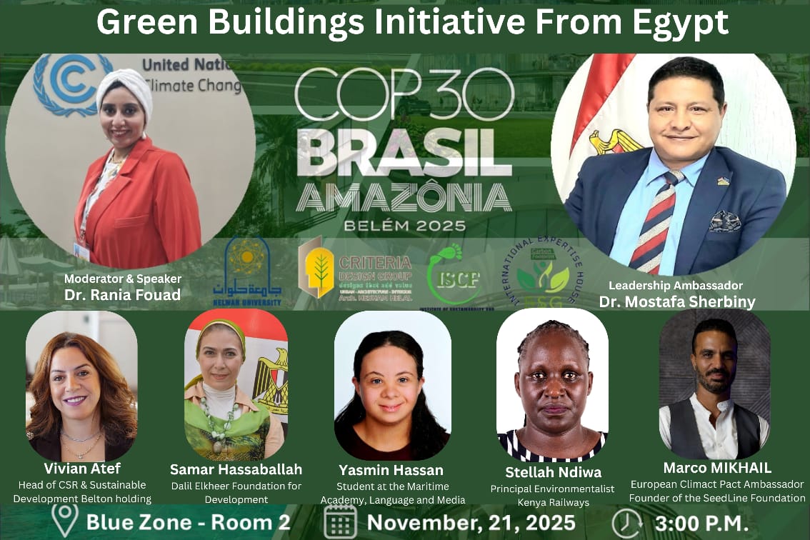 أعلن السفير مصطفى الشربيني، المراقب باتفاقية باريس بشأن تغيّر المناخ بالأمم المتحدة، ورئيس معهد الاستدامة والبصمة الكربونية، ورئيس مؤسسة الفريق التطوعي للعمل الإنساني، عن تنظيم ندوة رفيعة المستوى بعنوان: “المباني الخضراء: مبادرة من مصر نحو مستقبل مستدام”، وذلك ضمن فعاليات قمة المناخ COP30 المنعقدة بمدينة بيليم في منطقة الأمازون بالبرازيل.