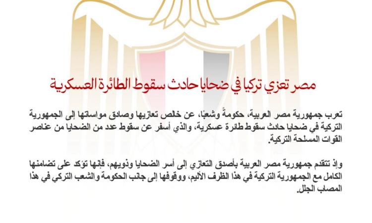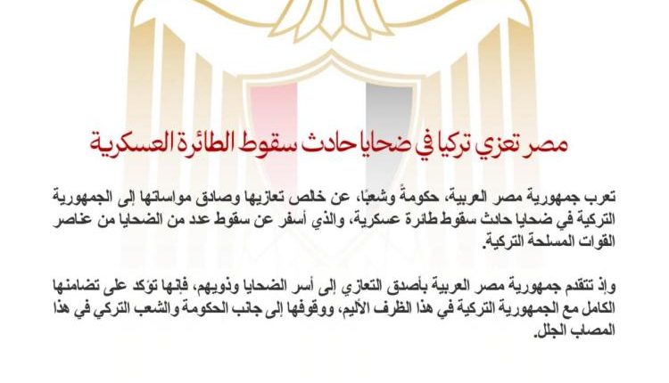 أعربت مصر، عن خالص تعازيها وصادق مواساتها إلى تركيا في ضحايا حادث سقوط طائرة عسكرية، والذي أسفر عن سقوط عدد من الضحايا من عناصر القوات المسلحة التركية.
