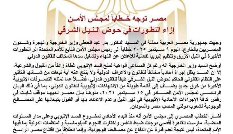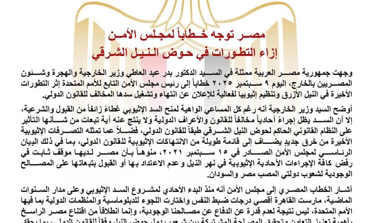 وجهت جمهورية مصر العربية ممثلة في الدكتور بدر عبد العاطي وزير الخارجية والهجرة وشئون المصريين بالخارج، اليوم الثلاثاء، خطاباً إلى رئيس مجلس الأمن التابع للأمم المتحدة إثر التطورات الأخيرة في النيل الأزرق وتنظيم إثيوبيا لفعالية للإعلان عن انتهاء وتشغيل سدها المخالف للقانون الدولي.