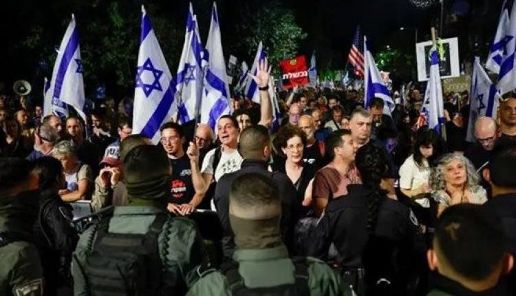 تجمع العشرات من الإسرائيليين أمام منزل رئيس الوزراء الإسرائيلي بنيامين نتنياهو صباح اليوم الأحد، احتجاجا على ممارسات حكومته وما يرونه “رحلة غير مبررة” إلى الولايات المتحدة.