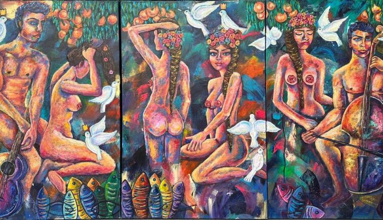 وفي عرض مجاور تقدم الفنانة ديانا قوسه أعمالها التي تعبر من خلالها عن كل شيء يشمل الجمال والطبيعة والرومانسية والفرح والسلام والشباب الذي يعود إلى بداية الخليقة قبل أن يُطرد آدم وحواء من الجنة، عندما كان كل شيء نقياً جداً، شاباً جداً، في بهاءه ورونقه وعلى أصله وصورته الطبيعة جداً، وكان من الممكن أن يظل هذا هو الحال دائماً لو لم يسقط آدم وحواء في الخطيئة، لكن الفنانة هنا خلقت عالماً خيالياً هرباً من الواقع، واقع العالم المؤلم والحزين، خلقت عالم يشبه الجنة ويظهر ذلك في العناصر التي تستخدمها، من الشخصيات الجميلة التي ترسمها ديانا، والطبيعة والآلات الموسيقية والفواكه والألوان الجريئة والمشرقة في لوحاتها، كل شيء جريء جداً، ونقي جداً، فهي تريد نشر البهجة وكل ذلك يعكس حلم ديانا بعالم رومانسي شاب، عالم طوباوي يعكس بداية الحياة، أصل الحياة، ولادة الحياة.