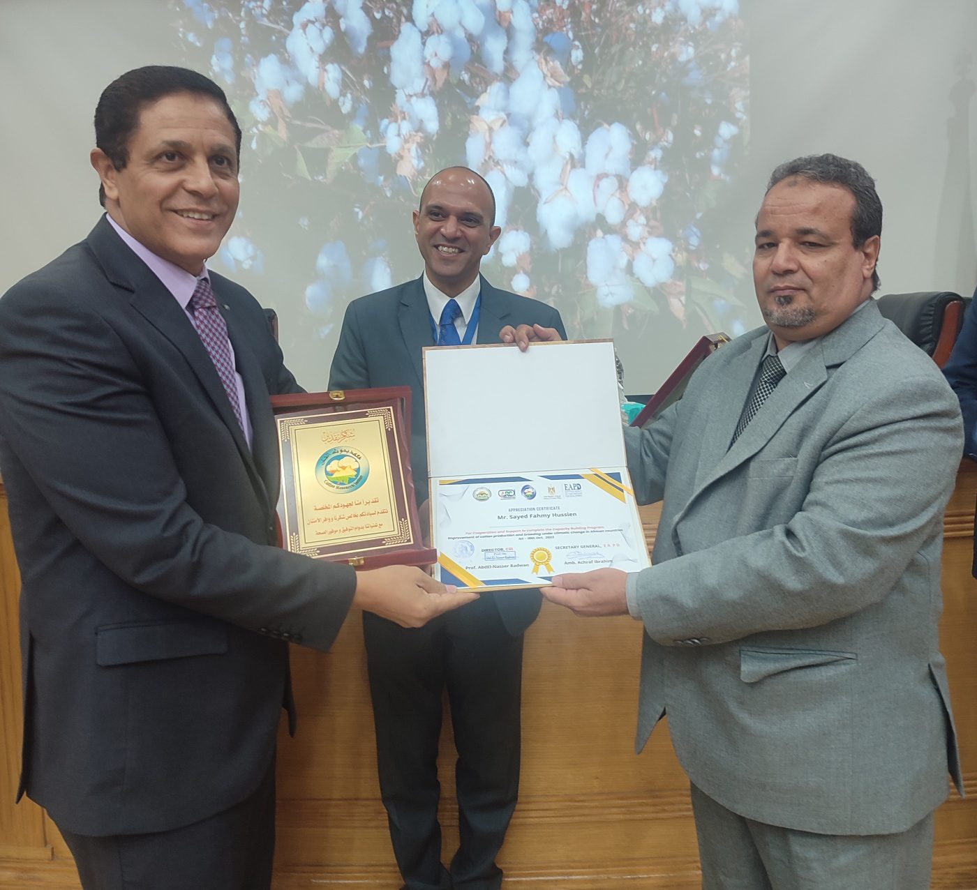 صرح الدكتور عبد الناصر رضوان – مدير معهد بحوث القطن، بأنه تم صباح امس الخميس الحفل الختامي للدورة الافريقية “تحسين إنتاج وتربية القطن تحت ظروف التغيرات المناخية” بحضور السفير حسن النشار – نائبًا عن الوكالة المصرية للشراكة من أجل التنمية، و سيد فهمي منسق البرنامج، الاستاذ الدكتور و شرين عاصم – نائب رئيس مركز البحوث الزراعية للبحوث، و الدكتور محمد عبد المجيد – رئيس مجلس القطن والالياف والمحاصيل الزيتية، و الدكتور أحمد عبد المغني – أستاذ التربية ومنسق الدورة، و المهندس خالد شومان – جمعية قطن مصر، ولفيف من قيادات المركز ومعهد القطن