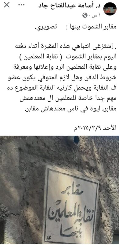 نشر الدكتور أسامة عبدالفتاح جاد ، صورة تحمل لافته موضوعه على أحد المقابر بقرية الشموت التابعة لمركز ومدينة بنها بمحافظة القليوبية ، مدون عليها عباره ” مقابر نقابة المعلمين بنها ” ، وقال ” اسامه ” عبر منشوره كيف لنقابة مهن تعليمية أن يكون لها مقابر ، متسائلاً ” هل من يريد أن يدفن فيها لابد أن يكون عضواً نقابي بنقابة المهن التعليمية ” ، وترددت الإجابة عبر تلك المنشور ، رودود تحمل سخرية واخري تسألت بنفس السؤال واخري كيف بنيت ومن أين الأموال المستخدمه فى الشراء والبناء .