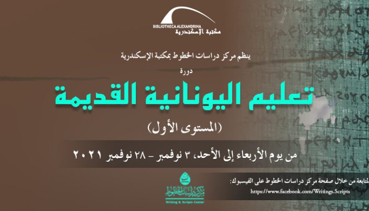 تبدأ دورة تعليم اليونانية القديمة من يوم الأربعاء، 3 نوفمبر 2021؛ إلى يوم الأحد، 28 نوفمبر 2021 يومي الأربعاء والأحد من كل أسبوع، من الساعة 1,00 إلى 3,00 مساءً بمكتبة الإسكندرية، المبنى الرئيسي، قاعة شراع الدور الثالث (F3). وللاشتراك بالدورة يرجى التوجه إلى مقر خزينة المكتبة، بالمستوى الثاني السفلي (B2)، مبنى المكتبة الرئيسي.