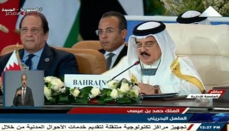 ووجه ملك البحرين الشكر للرئيس السيسي على دعوته الكريمة لعقد هذه القمة الدولية المهمة، وأشار إلى أن اجتماع اليوم من اجل السلام والخير لصالح الشعوب.